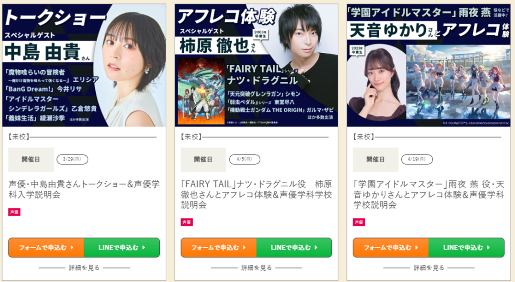 例えば上記の通り、オープンキャンパスひとつ取っても人気声優とのワークショップが特典として付いてきたりと至れり尽くせりな内容になっています。