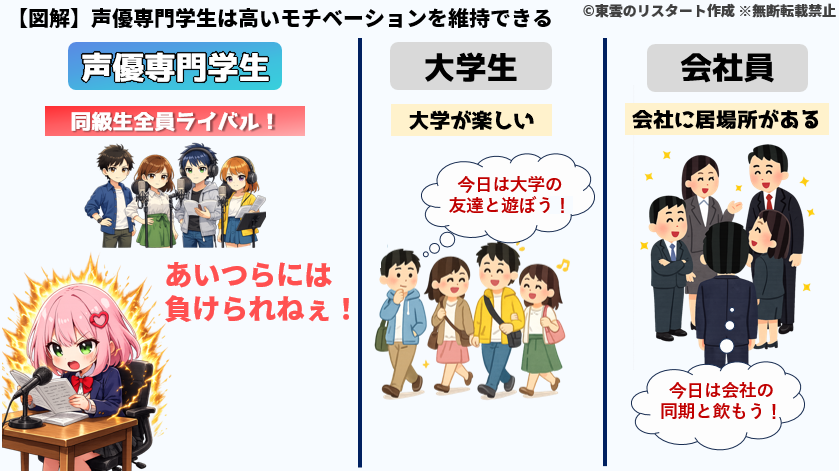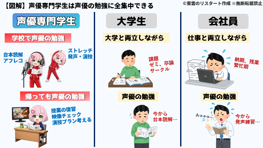 大学の課題または会社の仕事など、声優を目指す上で直接関係ないことに時間を使わずに済むのは大きなアドバンテージです。