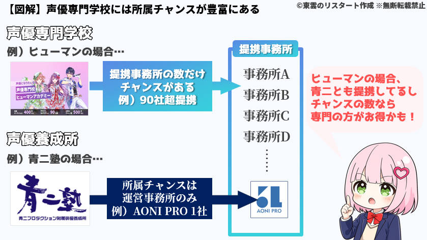 声優養成所の場合は所属審査に落ちてしまえばそこで終わりですし、デビューチャンスも運営元の声優事務所に限られますので……