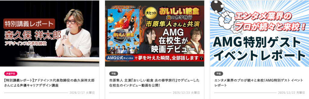 上述した通り、昨今の声優専門学校の基準では「声優業界との太いパイプを持っていること」は当たり前の話ではあるのですが、アミューズメントメディア総合学院は声優業界とのパイプの太さは他の学校よりも強い印象があります。
